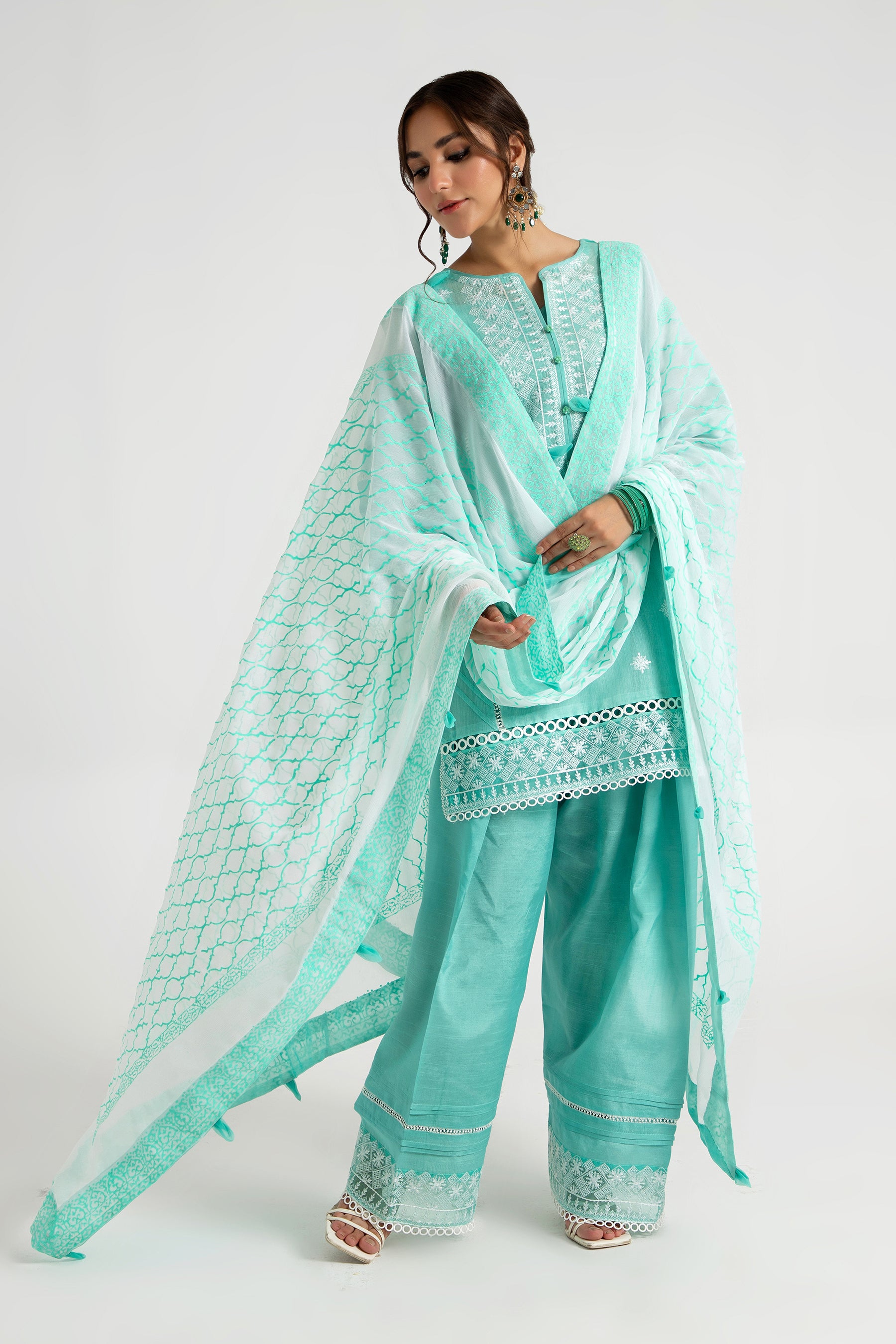 Dupatta: White chiffon dupatta with aqua block print border and jaal and fabric trims at the four sides.