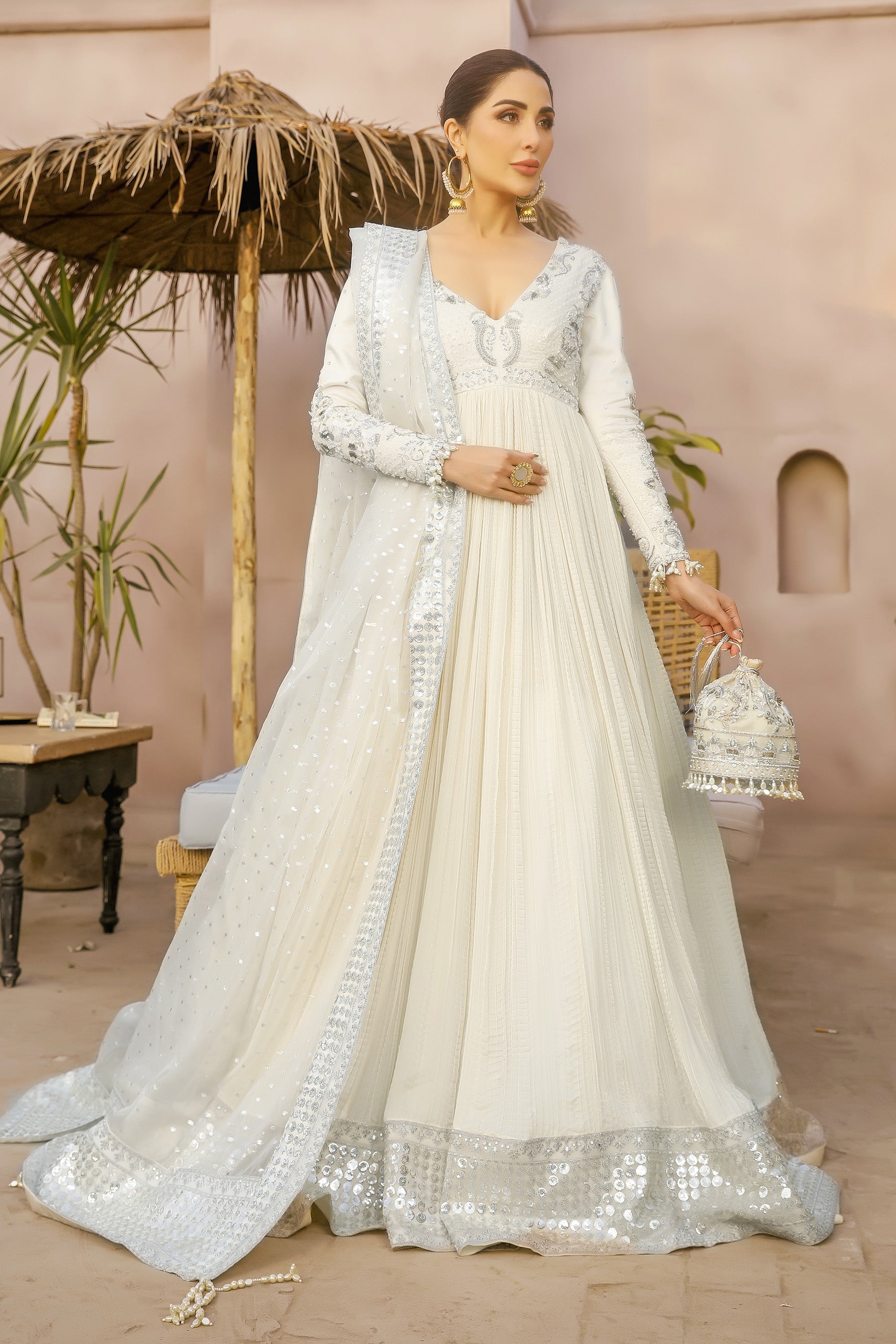 Description: Ajr-Indulge in the simplicity and elegance this ivory crushed pishwas with hand embellishment on the front bodice back and full sleeves and border on the hem having 300 inches flair.to ample the look this outfit comes with organza zari dupatta with four side border with same colour facing.tussles at the edges of the sleeves dupatta corner and back are inhancing the look.embellished potli is giving a complete look for this festive season.(back and neck line could be cover at ur demand)