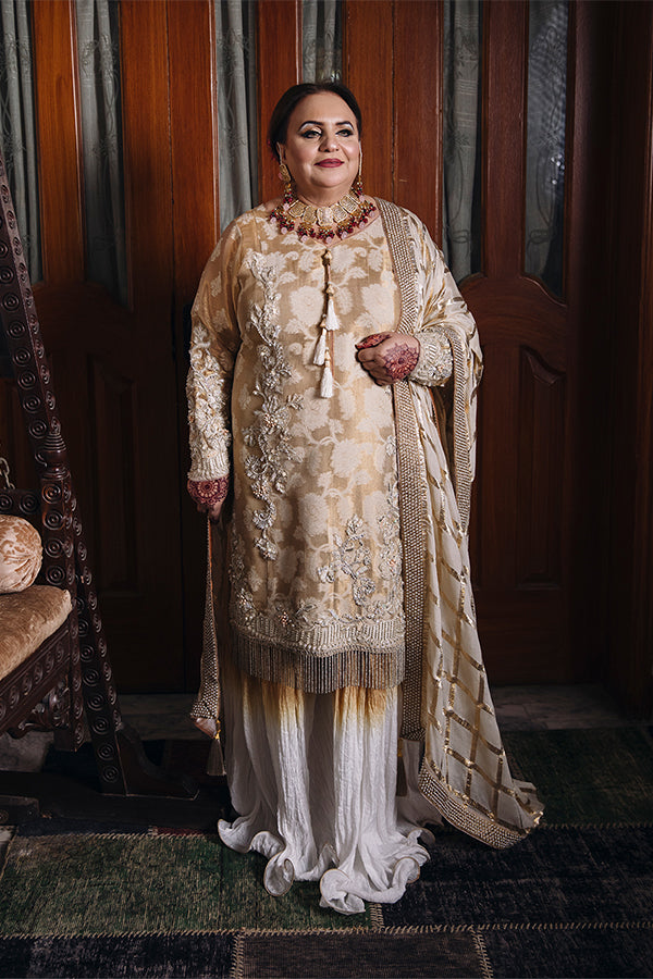 This gold and white tissue ensemble, embellished with totally modern techniques and materials.it is decorqted with pearls, resham, french knots, crystals and 3d material. It is true masterpiece combining contemperory crush two colour silk sharara along with side knot tussles.