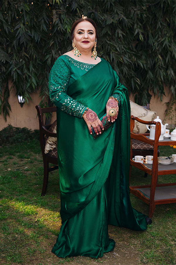 This elegant emerald green Silk sari is aestheticaly decked with same colour rawsilk blouse which is decorated with hand resham, mirrors amd kundan. Coordinating embellishments on sleeves openings and beautiful motifs and jaal on the bicep with detailed back neck with the hole and tussles are making it complete and a sheek look for your next event.