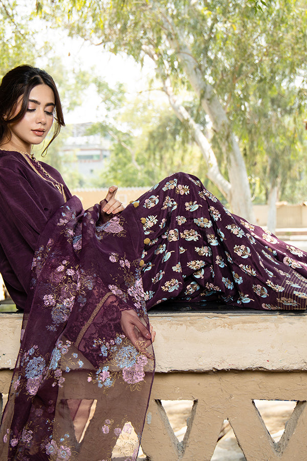 Kohsar comes along with laces and embroidery borders trims with u shape ghera adorned with pom-poms.crystals buttons and detailed neckline is added to make it more trendy. It has screen print Farshi shalwar with organza dupatta.