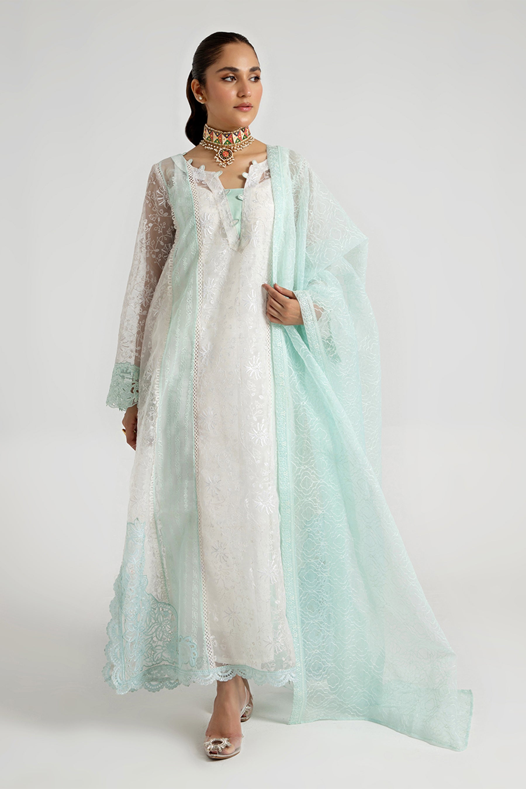 White and aqua aline loose fit organza embroidered pannel shirt with loops neckline and embroidered scallop and cutwork borders and sleeves hem.