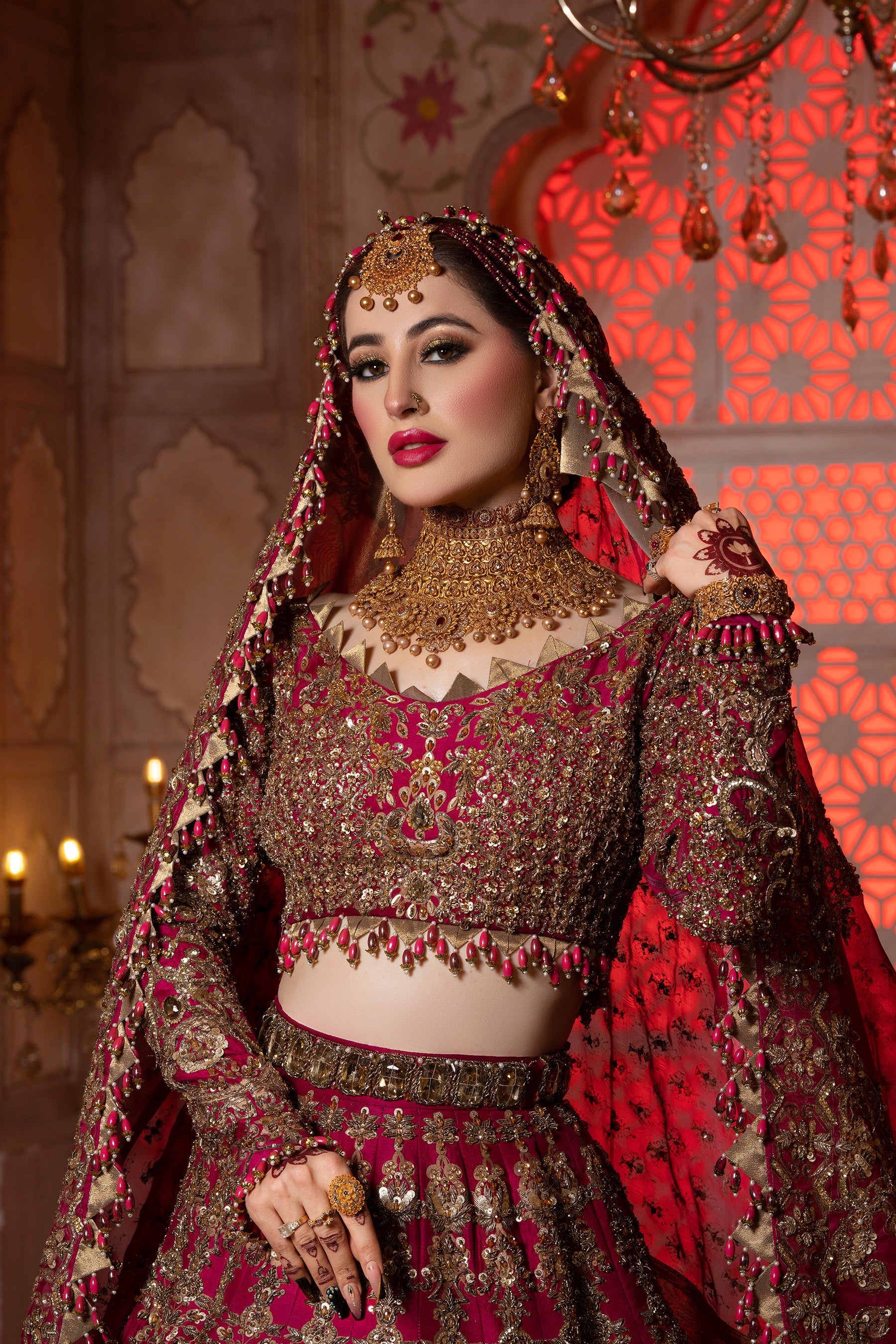 This burgendy beautiful bridal lehanga choli crafted on a pure 80 grm raw silk base.it is heavily hand embellished and composed with our signature jewel motifs with pitta work, dabka,kira, sitara,pearls and kundan.it comes with 4.5 yard heavy spray dupatta with accents of pearl,naqshi,pitta and framed with a hand rendered border beautifuly tissue fabrication and hangings on the hem making this outfit more royal and trendy. It comes along with beautiful clutch with hand embellished peacocks on it and beautiful hangings all over the dress.